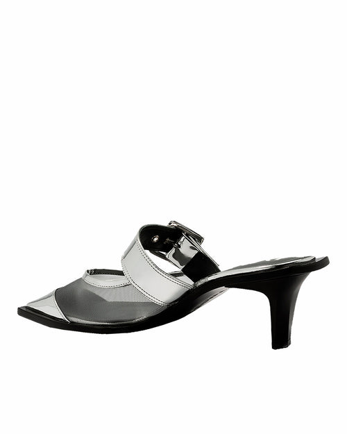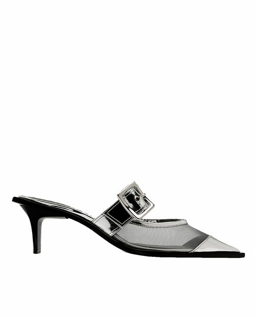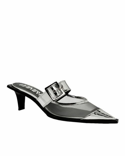 The Luxe Mule is constructed in laminated calf leather and mesh with a pointed front and exposed arch.