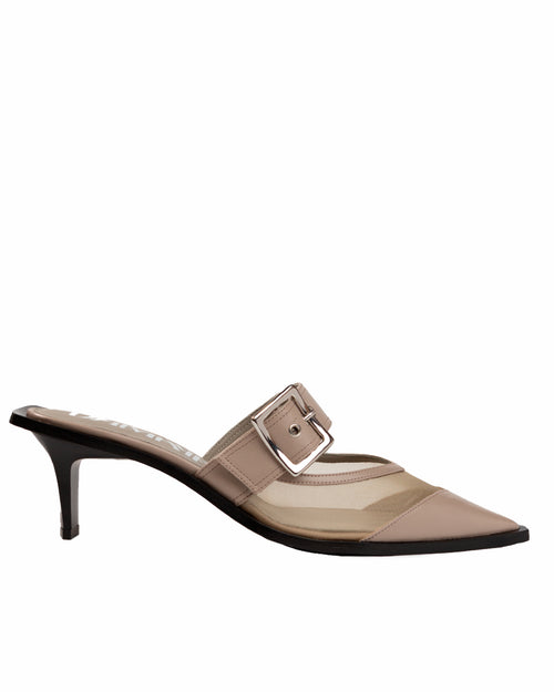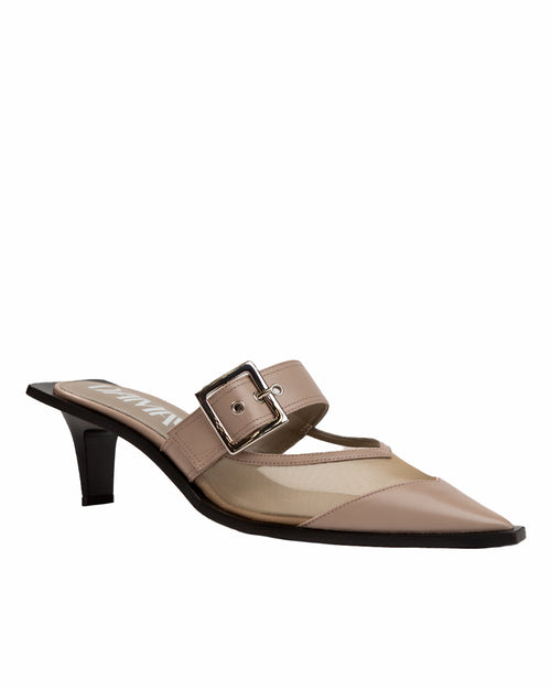 The Luxe Mule is constructed in nappa calf leather and mesh with a pointed front and exposed arch.